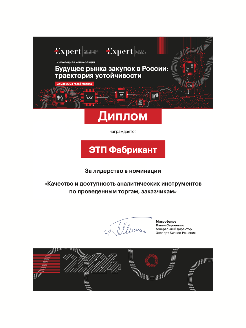 Каждый год международное рейтинговое агентство RAEX («Эксперт РА») подтверждает высокий уровень экспертизы, конкуренции и качества сервиса ЭТП «Фабрикант». Это признание основано на результатах опроса среди крупнейших компаний-заказчиков в России.